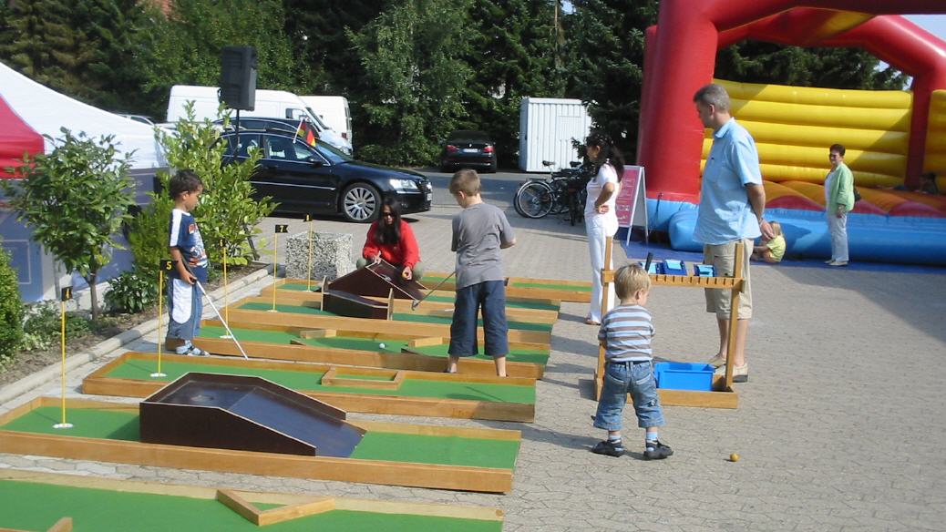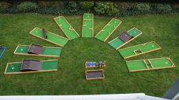 Die mobile Minigolfanlage ist mit ihren neun unterschiedlich schwierig gestalteten Bahnen ein großer Spaß für jung und alt. Natürlich sind Bälle, Schläger, Fahnen für die Bahnmarkierung und Spielblöcke für die Teilnehmer mit dabei. Laden Sie ihre Kunden oder Gäste doch einmal zu einem Turnier ein. Wir helfen Ihnen gerne bei der Organisation Ihres Minigolf Wettbewerbes, sprechen Sie uns bei der Buchung einfach dazu an. Mit der entsprechenden thematischen Gestaltung fügen sich die Minigolf perfekt in das Motto Ihrer Veranstaltung ein.